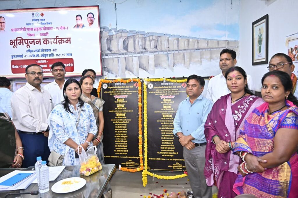 धमतरी। मुख्यमंत्री ने जशपुर के रणजीता स्टेडियम में आयोजित राज्य स्तरीय कार्यक्रम में प्रधानमंत्री ग्राम सड़क योजना (PMGSY) के अंतर्गत स्वीकृत फेस-4 की 774 सड़कों का भूमि पूजन किया। जिनके निर्माण पर लगभग 2225.44 करोड़ रुपए की लागत आएगी।इस योजना में धमतरी जिले की 2 सड़कें भी शामिल हैं, जिनकी कुल लंबाई 11.45 किलोमीटर है तथा इनके निर्माण हेतु 752.27 लाख रुपए की राशि स्वीकृत की गई है।इन सड़कों के निर्माण से जिले के ग्रामीण क्षेत्रों में आवागमन सुगम होगा तथा सामाजिक-आर्थिक विकास को नई गति मिलेगी।कार्यक्रम में उप मुख्यमंत्री विजय शर्मा, विधायक गोमती साय एवं रायमुनी भगत सहित अन्य जनप्रतिनिधि उपस्थित रहे। इस अवसर पर मुख्यमंत्री ने “मोर गांव मोर पानी मोर तरिया” महाअभियान का भी शुभारंभ किया, जिसका उद्देश्य जल संरक्षण एवं ग्रामीण संसाधनों के सुदृढ़ प्रबंधन को बढ़ावा देना है।धमतरी कलेक्ट्रेट में आयोजित वर्चुअल कार्यक्रम में जिला पंचायत अध्यक्ष अरुण सर्वा, जनपद पंचायत अध्यक्ष अंगीरा ध्रुव, विधायक प्रतिनिधि, पंच-सरपंच, मुख्य कार्यपालन अधिकारी जिला पंचायत सहित संबंधित अधिकारी-कर्मचारी उपस्थित रहे।वहीं अरुण सर्वा ने कलेक्ट्रेट परिसर में प्रधानमंत्री ग्राम सड़क योजना अंतर्गत स्वीकृत दोनों सड़कों का विधिवत भूमि पूजन एवं शिलान्यास किया।कहा कि ये सड़कें ग्रामीण अंचलों के लिए विकास की नई राह खोलेंगी।“बेहतर सड़क संपर्क से गांवों में शिक्षा, स्वास्थ्य एवं बाजार तक पहुंच आसान होगी, जिससे ग्रामीण अर्थव्यवस्था को मजबूती मिलेगी।