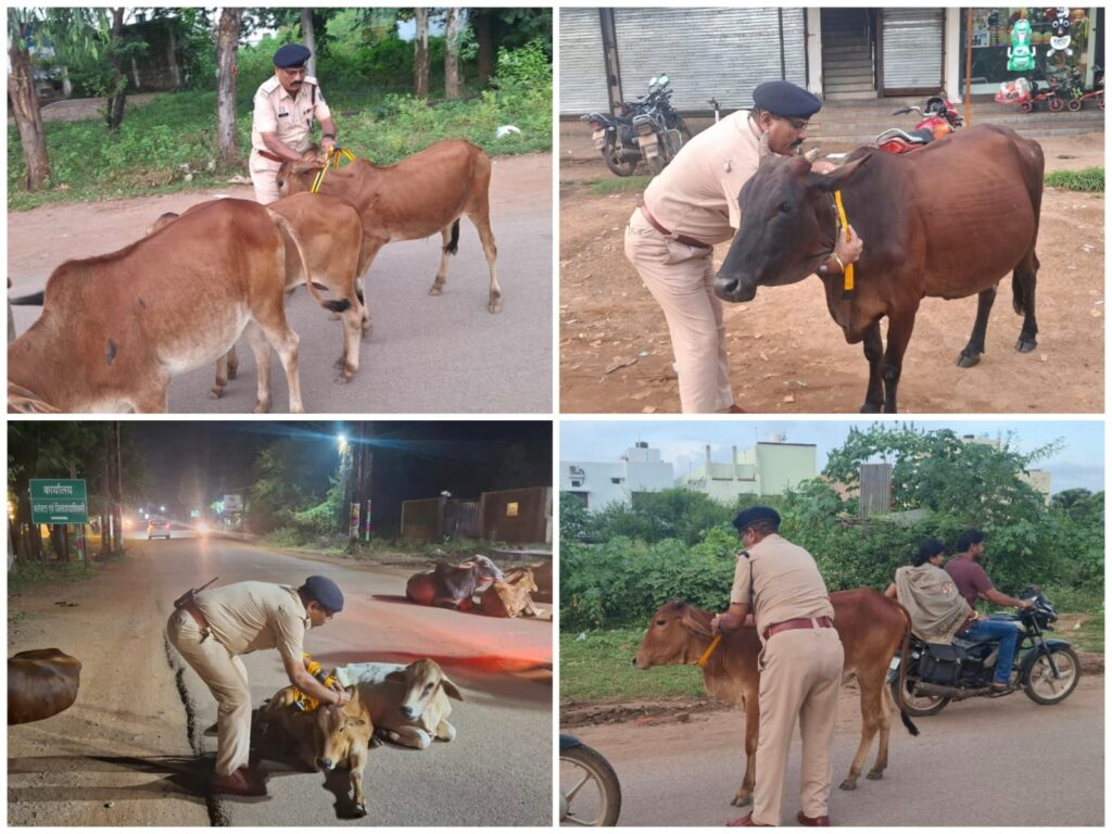 धमतरी।टीम द्वारा सड़क दुर्घटनाओं को रोकने और यातायात को सुरक्षित एवं व्यवस्थित बनाने का प्रयास किए जा रहे हैं। इसी क्रम में एक अनूठी पहल की शुरुआत की गई है, जिसके अंतर्गत आवारा मवेशियों के गले में रेडियम रिफ्लेक्टर बेल्ट लगाए जा रहे हैं।बेल्ट वर्धमान स्थानकवासी जैन गुजराती संघ एवं पशुधन विकास विभाग द्वारा भेंट किए गए हैं। इनका प्रयोग कर यातायात पुलिस ने एक नवाचार के रूप में सुरक्षा को और प्रभावी बनाया है।