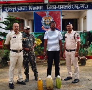 धमतरी। थाना सिहावा को मुखबिर से सूचना प्राप्त हुई कि ग्राम कोरमुडपारा, सांकरा में एक व्यक्ति अपने घर में हाथ भट्टी से बनी कच्ची महुआ शराब अवैध रूप से बिक्री कर रहा है। सूचना की पुष्टि के लिए पुलिस टीम तत्काल मौके पर पहुँची और संदिग्ध को पकड़कर नाम-पता पूछने पर अपना नाम लक्ष्मीनाथ ध्रुव, उम्र 36 वर्ष, निवासी कोरमुडपारा वार्ड क्रमांक-15, ग्राम सांकरा, बताया।आबकारी एक्ट के तहत पर्याप्त साक्ष्य पाये जाने से आरोपी के विरूद्ध धारा 34(1)(क), 34(1)(च), 34(2), 59(क) के तहत अपराध पंजीबद्ध कर आरोपी को विधिवत गिरफ्तार कर न्यायिक रिमांड पर जेल भेजा गया है।