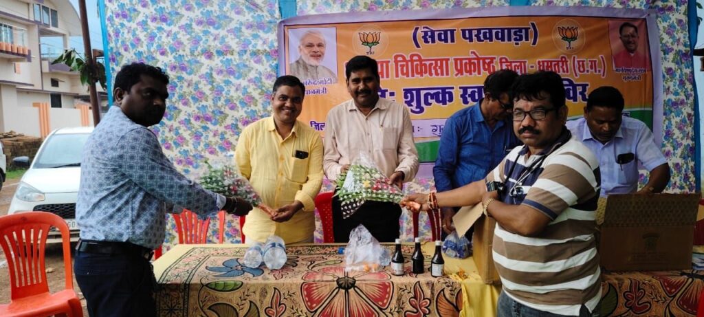 धमतरी। जिला चिकित्सा प्रकोष्ठ के द्वारा ग्राम गुजरा में स्वास्थ्य शिविर का आयोजन किया गया,अतिथि उमेश साहू,महामंत्री राकेश साहू, जिला संयोजक चिकित्सा प्रकोष्ठ गजेंद्र साहू,जनपद सदस्य फगेश्वरी साहू, दुर्गेश्वरी साहू सरपंच, डॉ ललित साहू, डॉ रामायण साहू,डॉ शेखर,चितरंजन साहू,राजेश साहू,उपस्थित रहे और लगभग 200 मरीज का इलाज कर दवाई वितरण किया।डॉ गजेंद्र ने कहा  भारतीय जनता पार्टी राष्ट्र के लिए काम करने वाली पार्टी है वह  नेताओं और महापुरुषों के जन्मदिन को सेवा के रूप में मानती है। राष्ट्र की सेवा के साथ जनता की सेवा परम लक्ष्य है, जिसको चरितार्थ करते हुए हमने शिविर का आयोजन किया।आम जनता शिविर की प्रशंसा किए, शिविर का लाभ लिए और धन्यवाद प्रेसित किए।लाभ लेने वालों में मुख्य रूप से चित्रलेखा साहू ,ममता साहू, रामनारायण निर्मलकर ,प्रद्युम्न साहू, अग्नीबाई, प्रेमीन बाई ,प्रद्युम्न साहू चुरामन लाल साहू, राम भगत साहू के साथ सैकड़ो ग्रामीण लाभ लिए।