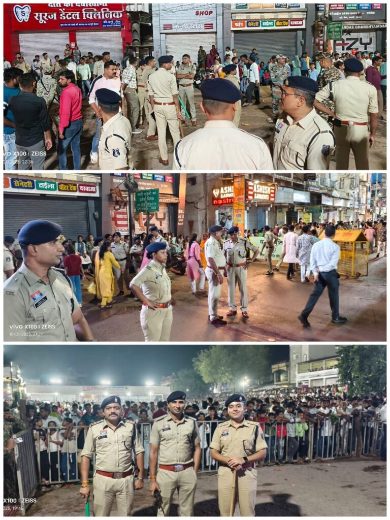 धमतरी। दुर्गा की झांकी एवं विसर्जन तथा दशहरा के दौरान संपूर्ण जिले में सुरक्षा व्यवस्था चाक-चौबंद रही।निर्धारित रूट पर जगह-जगह पर पुलिस बल की तैनाती की गई थी। स्वयं एसपी अधिकारियों से हर स्थिति की जानकारी लेते रहे और सुरक्षा व्यवस्था की मॉनिटरिंग करते रहे।सादे वर्दी में पुलिसकर्मी, महिला बल, यातायात पुलिस के साथ-साथ ड्रोन कैमरा, वीडियोग्राफी एवं फोटोग्राफी के माध्यम से सतत् निगरानी रखी गई।अधिकारी स्वयं स्थल पर मौजूद रहकर हर स्थिति पर बारीकी से नजर रखे हुए थे।अनुभागों में दुर्गा की बड़ी एवं छोटी प्रतिमाओं का विसर्जन एवं दशहरा त्यौहार श्रद्धा और उल्लास के साथ सम्पन्न हुआ।