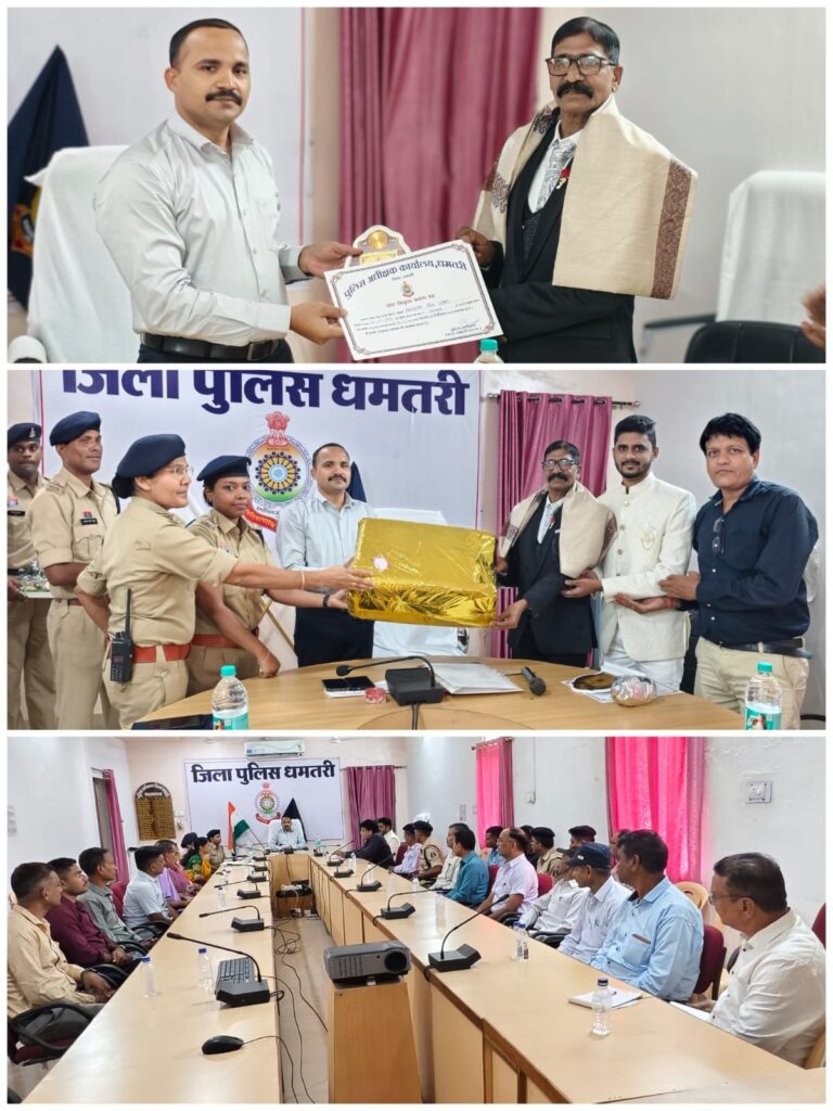 धमतरी। सेवानिवृत्ति अवसर पर पुलिस अधीक्षक कार्यालय में विदाई समारोह आयोजित किया गया।पुलिस अधीक्षक परिहार ने पुलिस परिवार के वरिष्ठ सदस्य सहायक उप निरीक्षक दिलहरण सिंह ठाकुर को शाल, श्रीफल एवं उपहार भेंट कर सम्मानित किया तथा उनके दीर्घ सेवा काल की सराहना करते हुए कहा किठाकुर ने अपने 42 वर्षों के सेवाकाल में विभाग की गरिमा और अनुशासन को सर्वोपरि रखा है।उन्होंने निष्ठा, ईमानदारी और समर्पण के साथ कर्तव्यों का निर्वहन किया है।वरिष्ठ अधिकारियों के मार्गदर्शन में कार्य करते हुए हमेशा विभाग की प्रतिष्ठा को बढ़ाया।मैं इनके उज्ज्वल भविष्य, उत्तम स्वास्थ्य और पारिवारिक सुख-समृद्धि की हार्दिक शुभकामनाएं देता हूँ।सहकर्मियों ने दिलहरण सिंह ठाकुर के सरल, सौम्य और सहयोगी व्यवहार की सराहना करते हुए कहा कि सदैव सभी के प्रति आदर और सहयोग का भाव रखा।सभी ने उन्हें बेहतर स्वास्थ्य, सुखमयपारिवारिक जीवन और दीर्घायु की शुभकामनाएं दीं।तथा सेवानिवृत्ति उपरांत शासकीय वाहन से उनके निवास स्थान तक ससम्मान विदा किया।