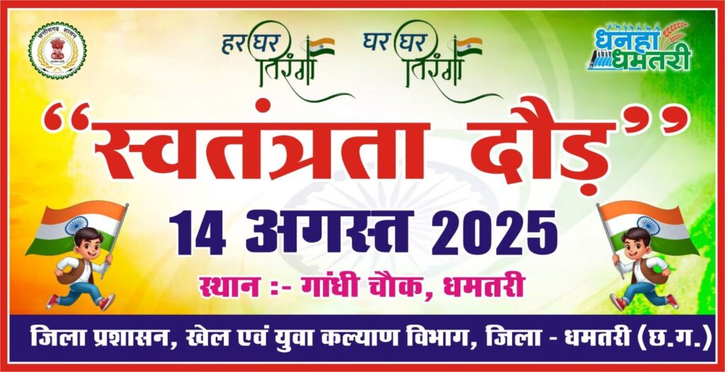 धमतरी,जिला प्रशासन एवं खेल एवं युवा कल्याण विभाग,के संयुक्त तत्वावधान में प्रतिवर्ष की भांति इस वर्ष भी जिला कलेक्टर अबिनाश मिश्रा के मार्गदर्शन में स्वतंत्रता दौड़ का भव्य आयोजन 14 अगस्त गुरुवार को किया जा रहा है,आयोजन आज़ादी के महोत्सव की कड़ी में स्वतंत्रता दिवस की पूर्व देशभक्ति की भावना को जागृत करने, स्वास्थ्य और फिटनेस के महत्व को रेखांकित करने तथा जन-जन में राष्ट्रीय एकता का संदेश फैलाने के उद्देश्य से किया जा रहा है,दौड़ सुबह 7:30 बजे स्थानीय गांधी चौक मैदान (सिटी कोतवाली) से किया जाएगा, दौड़ का मार्ग इस प्रकार होगा गांधी चौक मैदान -गोलबाजार -घड़ी चौक -भगवती लॉज -देवश्री टॉकीज रोड -शिव चौक -सेंचुरी गार्डन- गांधी चौक मैदान पर समापन।
