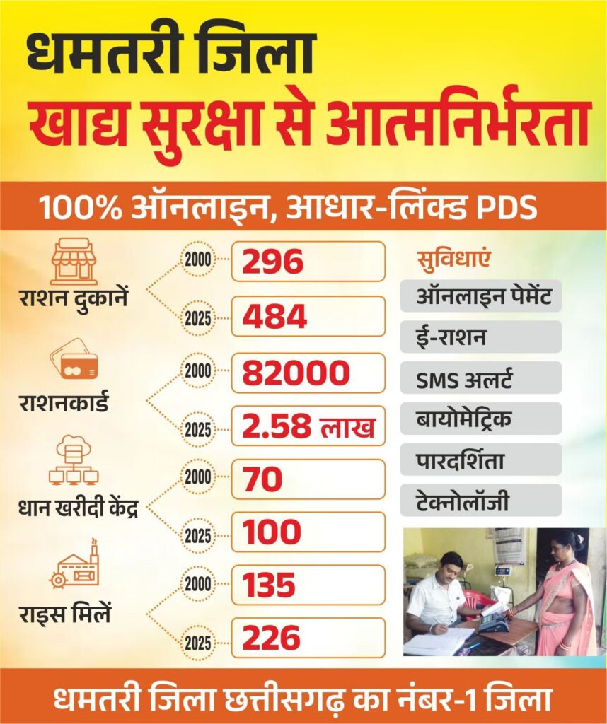 सार्वजनिक वितरण प्रणाली में डिजिटल पारदर्शिता वर्ष 2000 में जिले में 296 शासकीय उचित मूल्य दुकानें संचालित थीं, जिसमें ऑफलाइन प्रणाली से राशन वितरण किया जाता था जो पारदर्शिता और समयबद्धता की चुनौतियाँ बनी रहती थींवर्तमान में विभाग द्वारा पूर्णतः ऑनलाइन आधार प्रणाली लागू की जा चुकी है। आज जिले की 484 शासकीय उचित मूल्य दुकानों के माध्यम से हितग्राहियों को सुगमता, पारदर्शिता और सटीकता के साथ खाद्यान्न वितरण सुनिश्चित किया जा रहा है। इस पहल से वितरण प्रक्रिया में पारदर्शिता आई है तथा राशनकार्डधारियों को समय पर एवं निर्धारित मात्रा में खाद्यान्न उपलब्ध हो रहा है।यह वृद्धि इस तथ्य को प्रमाणित करती है कि विभाग ने सामाजिक सुरक्षा एवं खाद्य अधिकार को सुदृढ़ करने में प्रभावी भूमिका निभाई है।धान खरीदी के क्षेत्र में विस्तार हुआ है।जो बढ़कर 100 केंद्रों तक पहुँच चुके हैं।केंद्रों के माध्यम से किसानों को न्यूनतम समर्थन मूल्य (एमएसपी) पर धान विक्रय की सुविधा प्रदान की जा रही है, जिससे आय में वृद्धि हुई और आर्थिक सुरक्षा सुनिश्चित हुई हैकस्टम मिलिंग में भी वृद्धि हुई इससे खरीदे गए धान की समय पर कस्टम मिलिंग तथा चावल की सुनिश्चित आपूर्ति संभव हो पाई है।