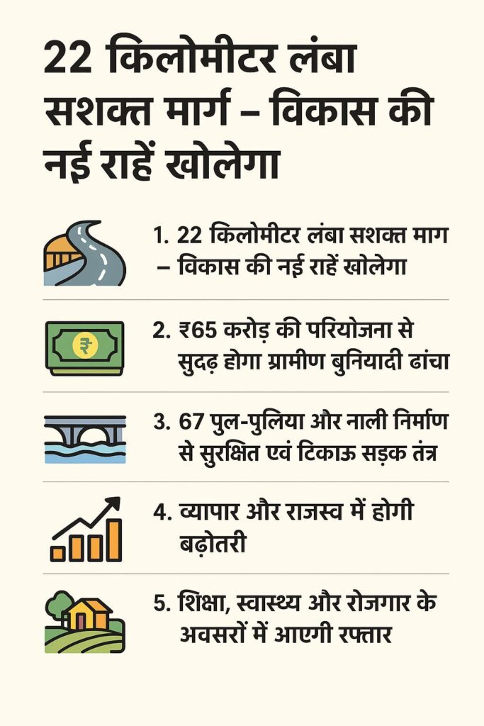 धमतरी। लोक निर्माण विभाग द्वारा 22.00 कि.मी. लंबे मार्ग के लिए राशि ₹6512.84 लाख की प्रशासकीय स्वीकृति प्रदान की गई थी।कार्य की निर्धारित अवधि 18 माह रखी गई है। इस परियोजना के अंतर्गत 67 नग पुल-पुलिया का निर्माण, नाली निर्माण तथा सम्पूर्ण मार्ग का चौड़ीकरण एवं मजबूतीकरण किया जाएगा।निर्माण संस्था द्वारा कार्य का प्रारंभ कर दिया गया है। अब तक 2118 मीटर नाली एवं 12 नग पुल-पुलिया निर्माण कार्य पूर्ण किए जा चुके हैं एवं इंबेकमेंट कार्य प्रगतिपर है।कार्य की गुणवत्ता और मापदण्डों के पालन हेतु विभागीय अधिकारी एवं उप अभियंता लगातार सामग्री की जांच एवं परीक्षण कर रहे हैं।वहीं,बैठक में कलेक्टर द्वारा भी नियमित निरीक्षण एवं मॉनिटरिंग के निर्देश जारी किए गए हैं। इस मार्ग से बड़े पैमाने पर रेत परिवहन किया जाता है, जिससे राजस्व में भी वृद्धि होगी। मार्ग के पूर्ण होने से दुर्ग एवं धमतरी के बीच आवागमन सुगम होगा तथा ग्राम कुरमातराई, भेण्ड्रा, कोर्रा, जुगदेही, सिलौटी और सेमरा सहित आसपास के ग्रामीणों को शिक्षा, स्वास्थ्य, व्यापार एवं आर्थिक गतिविधियों में नई गति मिलेगी।