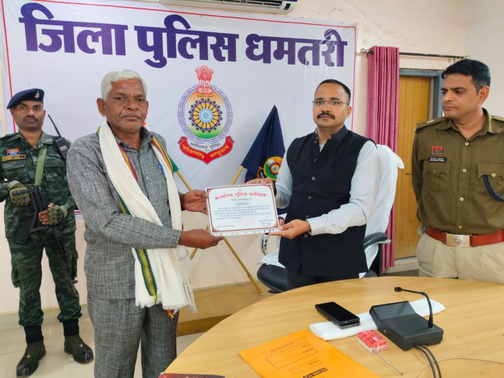 धमतरी।कुरूद विकासखंड के ग्राम बगदेही में रविवार को ऑटो चालक की लापरवाही के कारण बुजुर्गों एवं छोटे बच्चों से भरा एक ऑटो अनियंत्रित होकर गहरे कुएं में जा गिरा।जिसमें चालक सहित कुल 7 लोग सवार थे, जिनमें 3–4 वर्ष के मासूम बच्चे एवं बुजुर्ग शामिल थे।जिसे देखकर जयंत ध्रुव ने अपनी जान की परवाह किए बिना कुएं में कूदकर दुर्घटनाग्रस्त लोगों को सुरक्षित बाहर निकालना,यह समाज के लिए अत्यंत प्रेरणास्पद है। ऐसे साहसी नागरिक समाज में मानवता, कर्तव्य और साहस की मिसाल प्रस्तुत करते हैं।इस अवसर पर एसपी परिहार ने ध्रुव के उज्ज्वल भविष्य एवं दीर्घायु की कामना करते हुए,उन्हें प्रशस्ति पत्र प्रदान कर सम्मानित किया।