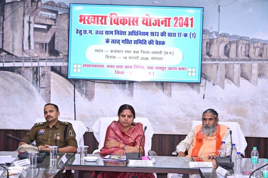 धमतरी। छत्तीसगढ़ नगर तथा ग्राम निवेश द्वारा तैयार किए जा रहे भखारा विकास योजना (प्रारूप) 2041 के संबंध में गठित समिति की बैठक आयोजित की गई। बैठक की अध्यक्षता सांसद रूपकुमारी चौधरी ने की।चौधरी ने कहा कि क्षेत्र के संतुलित एवं समग्र विकास के लिए दीर्घकालीन योजना अत्यंत आवश्यक है।विकास योजना तैयार करते समय स्थानीय नागरिकों की आवश्यकताओं, आधारभूत सुविधाओं के विस्तार, रोजगार सृजन तथा पर्यावरण संरक्षण को प्राथमिकता दी जाए।साथ ही योजना का वास्तविक लाभ आमजन तक पहुंचे और क्षेत्र को सुव्यवस्थित एवं आधुनिक स्वरूप प्रदान किया जाए।जिस पर अधिकारियों ने जानकारी दी कि भखारा क्षेत्र के नियोजित विकास के लिए छत्तीसगढ़ नगर तथा ग्राम निवेश अधिनियम 1973 की धारा 17(1) के तहत समिति का गठन किया गया है।प्रस्तावित योजना में कुल 25 ग्रामों को शामिल किया गया है,वर्ष 2041 की अनुमानित 90 हजार जनसंख्या को आधार मानकर विकास की रूपरेखा तैयार की गई है।योजना यूआरडीपीएफआई 2015 के दिशा-निर्देशों के अनुरूप तैयार की गई है,जिसमें आवासीय, वाणिज्यिक, औद्योगिक, सार्वजनिक एवं अर्धसार्वजनिक उपयोग, आमोद-प्रमोद, परिवहन, सार्वजनिक उपयोगिता तथा मिश्रित उपयोग के लिए भूमि आरक्षण का प्रस्ताव शामिल है।साथ ही वर्तमान आवश्यकताओं को ध्यान में रखते हुए नए मार्गों के विस्तार एवं सुदृढ़ीकरण का भी प्रावधान किया गया है।