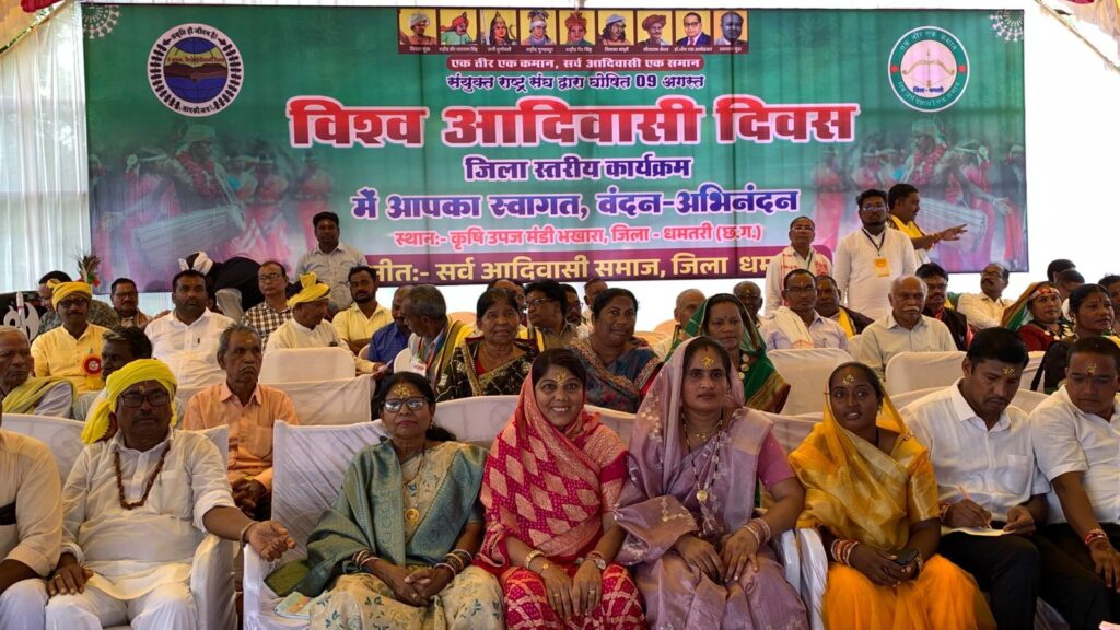 धमतरी,कृषि उपज मंडी भखारा में 9 अगस्त को विश्व आदिवासी दिवस के अवसर पर आदिवासी समाज की संस्कृति, परंपरा और अस्मिता को समर्पित गरिमामय कार्यक्रम का आयोजन किया गया,कार्यक्रम की शुरुआत मंदिर में सेवा अर्पण के साथ हुई, पश्चात परंपरागत श्रद्धा के साथ “जजा-जवारा यात्रा” निकाली गई,समारोह का प्रमुख आकर्षण “धरती आवा विरस मुंडा” तिरंगा ध्वज का अनावरण रहा, जो समाज की अस्मिता, एकता और स्वाभिमान का प्रतीक है, ध्वज अनावरण के बाद आदिवासी रीति से देव स्थापना की गई और विविध सांस्कृतिक कार्यक्रम प्रस्तुत किए गए, गोंडी, मुरिया, हल्बा, बैगा समुदायों द्वारा पारंपरिक लोकनृत्य की प्रस्तुति ने सभी को मंत्रमुग्ध कर दिया,प्रतिनिधियों ने अपने विचार व्यक्त करते हुए आदिवासी धर्म की मांग पर एकजुटता दिखाई और कहा कि यह मांग अब सिर्फ पहचान की नहीं, बल्कि अस्तित्व की है,“धरती आवा विरस मुंडा” विचारधारा के तहत समाज के युवाओं, महिलाओं और वरिष्ठजनों ने अपनी परंपरा और संस्कृति के प्रति सम्मान व्यक्त किया।